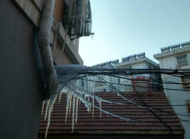 2月4日下午,淮海農(nóng)場(chǎng)城南15號(hào)樓樓頂出現(xiàn)自來(lái)水泄漏現(xiàn)象,泄漏下來(lái)的水流不僅把二樓墻壁上的空調(diào)凍成了冰凌團(tuán)子,漏下來(lái)的水沿著水管四濺,造成二樓的主樓梯口成了水簾洞,臺(tái)階也成了易滑跟頭的冰臺(tái)階。無(wú)論是空調(diào)還是冰臺(tái)階甚至高懸在頭頂?shù)谋?,都存有極大的安全隱患。