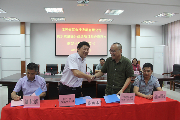 沈雪松表示,非常榮幸能夠見證江心沙農(nóng)場改革進程中具有里程碑意義的節(jié)點和事件。他說,江心沙從地理位置和感情上來講,和海門相濡以沫、唇齒相依,是一家人、一體化的。多年以來,場地之間一直相互支持、相互配合,共同促進、共同發(fā)展?,F(xiàn)根據(jù)上級要求,作為住建系統(tǒng),有責(zé)任有義務(wù)支持好江心沙的每一項改革。此前,海門市自來水公司與江心沙也進行了多次的磋商,前期工作已基本就緒,到了成熟階段。今天正式簽訂框架協(xié)議,標(biāo)志著江心沙供水質(zhì)量提升改造工程正式拉開了序幕。希望市自來水公司在以后的具體施工過程中,精心組織,按照時間節(jié)點,高質(zhì)量高標(biāo)準(zhǔn)完成場域供水改造工程。