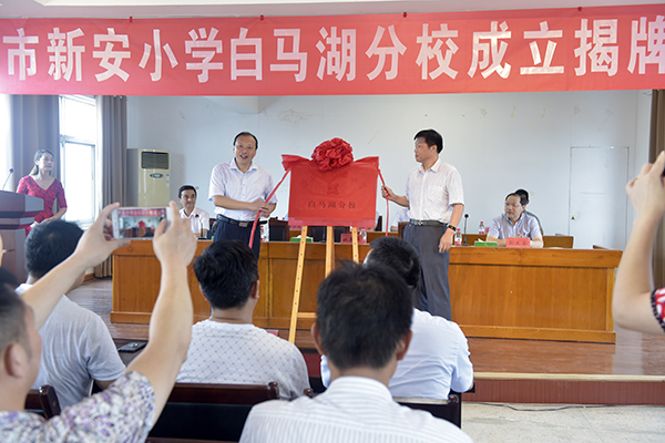 張大冬和白馬湖學(xué)??傂iL工楊國東代表合作雙方簽定聯(lián)合辦學(xué)協(xié)議,姚春華、咸勇為淮安市新安小學(xué)白馬湖分校揭牌。