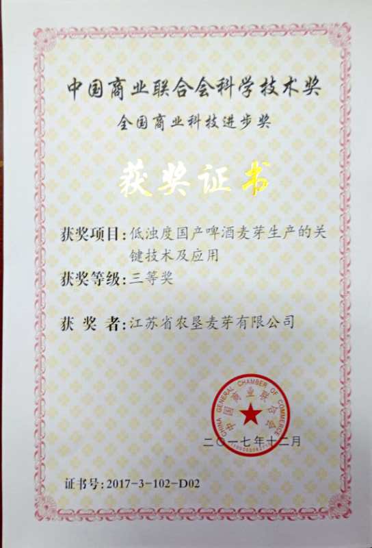 大會同時(shí)發(fā)布了2016年和2017年中國商業(yè)聯(lián)合會科學(xué)技術(shù)獎、服務(wù)業(yè)科技創(chuàng)新評獎結(jié)果,以及2017年全國商業(yè)質(zhì)量獎、零售企業(yè)服務(wù)質(zhì)量獎五星級單位。蘇墾麥芽公司《低濁度國產(chǎn)啤酒麥芽生產(chǎn)的關(guān)鍵技術(shù)及應(yīng)用》獲得全國商業(yè)科技進(jìn)步獎三等獎。