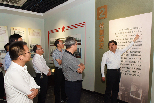 沿著農(nóng)建四師紀念碑雕像,毛澤東主席關(guān)于生產(chǎn)待命、建設農(nóng)場的命令碑文和農(nóng)建四師暨淮海農(nóng)場歷史陳列館,鄧慶海看得認真,聽得仔細,不時記下珍貴史料。農(nóng)建四師紀念碑雕像的含義,毛主席命令碑文,陳列館中的許多老照片、老物件和軍墾文化的情況介紹,鄧慶海都了然于心,對有的圖片、文字,他還掏出手機拍照留存。鄧慶海強調(diào),農(nóng)建四師是一支英雄的部隊,陳列館內(nèi)史料豐富、內(nèi)容詳實,是一個軍墾傳統(tǒng)文化教育的好平臺。今后要繼續(xù)發(fā)揮好陳列館的紅色教育作用,繼承發(fā)揚“艱苦奮斗、勇于奉獻、開拓創(chuàng)新”的蘇墾精神,讓更多人的思想在這里得到軍墾傳統(tǒng)文化的洗禮。