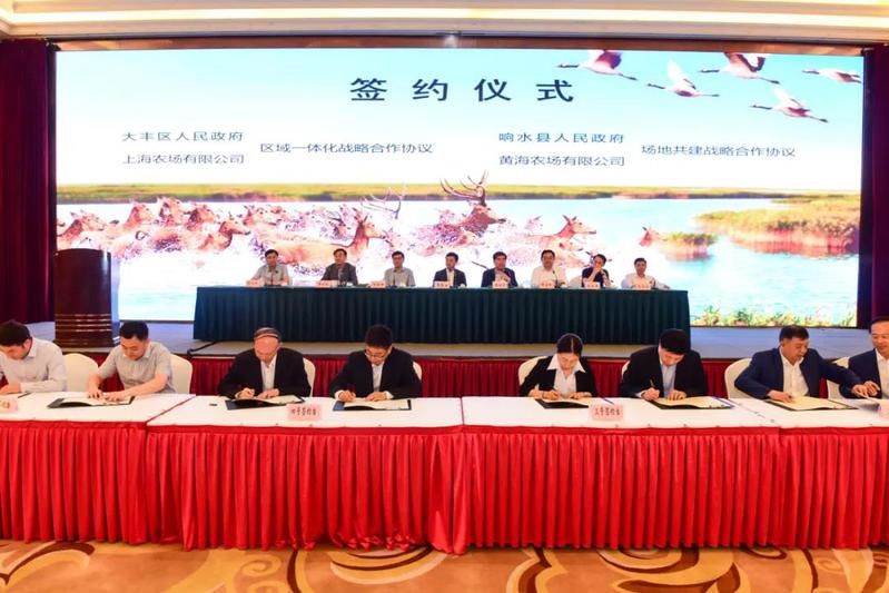 省農(nóng)墾集團(tuán)黨委書記、董事長(zhǎng)魏紅軍,省沿海開(kāi)發(fā)集團(tuán)黨委書記、董事長(zhǎng)鄧東升,上海光明食品集團(tuán)黨委委員、副總裁許如慶,省司法廳黨委委員、省戒毒管理局黨委書記、局長(zhǎng)高如軍,省農(nóng)業(yè)農(nóng)村廳二級(jí)巡視員俞衛(wèi)東等農(nóng)場(chǎng)上級(jí)主管單位負(fù)責(zé)同志和滬屬、省屬農(nóng)場(chǎng)代表應(yīng)邀出席并講話,與會(huì)人員高度評(píng)價(jià)我市的創(chuàng)新舉措,認(rèn)為這必將打造農(nóng)業(yè)農(nóng)村高質(zhì)量發(fā)展新樣板。會(huì)議還現(xiàn)場(chǎng)簽訂了一批地方和農(nóng)場(chǎng)項(xiàng)目合作協(xié)議。