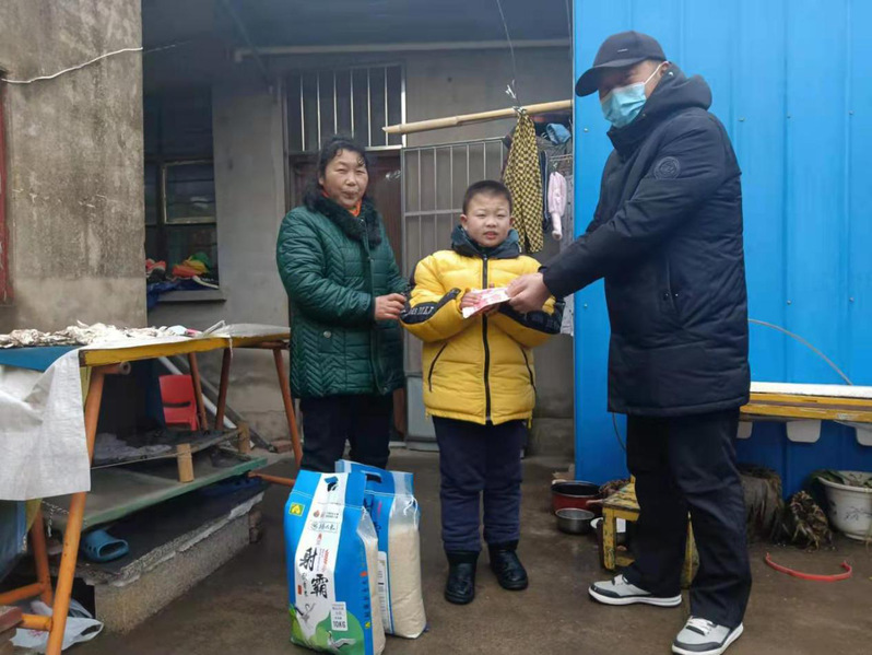 原來,家住城西振興小區(qū)做糧食生意的個體老板陸同聯(lián)特地在節(jié)日來臨之際,請城西居委會主任臧成龍代他向轄區(qū)貧困戶獻愛心。據(jù)悉,這也是陸同聯(lián)第五次給貧困職工送米送錢了。2018年2月12日,陸同聯(lián)隱姓埋名委托臧成龍為城西居委會建檔立卡貧困戶嚴建明和身患重病致貧的朱懷兵家各送上了1000元現(xiàn)金和2袋大米;2018年中秋節(jié)為這兩個特殊家庭各送去500元現(xiàn)金表愛心;2019年1月10日為這兩個特殊家庭各送去2袋大米和500元現(xiàn)金;2020年1月20日為這兩個特殊家庭各送去2袋大米和500元現(xiàn)金;而今年陸同聯(lián)再一次延續(xù)了去年的做法,委托臧成龍在節(jié)前為貧困職工表上心意。