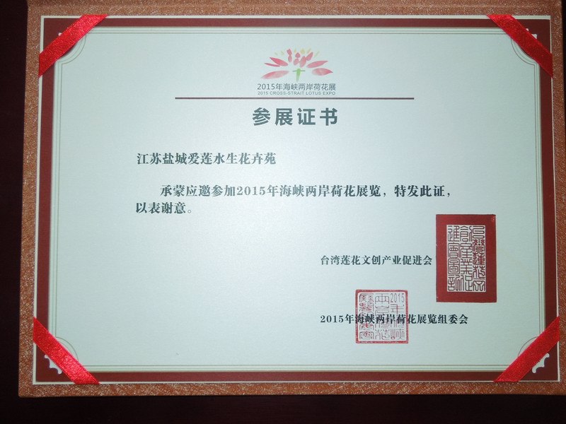 此后,我又建議他去射陽縣城,請國內著名書法家唐熙書寫“愛蓮苑”三字,去射陽縣原工商局注冊“愛蓮苑”商標,以唐熙的“愛蓮苑”三字作為商標圖案。李吉厚采納了我的建議。圖為愛蓮苑參加2015年海峽兩岸荷花展參展證書。