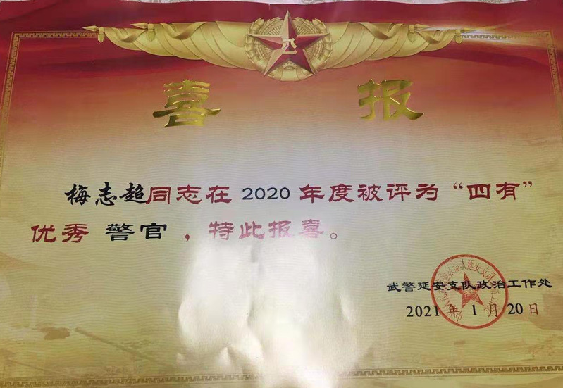 梅志超1995年7月出生,2013年9月考上4+1軍校,取得了雙學(xué)士學(xué)位,畢業(yè)后在中國(guó)人民武裝警察部隊(duì)延安支隊(duì)服役;通過(guò)開(kāi)展送立功喜報(bào)活動(dòng),讓軍人、軍屬感到光榮,讓官兵感到溫暖,增強(qiáng)現(xiàn)役官兵的光榮感、自豪感和使命感,增強(qiáng)立功受獎(jiǎng)家屬的榮譽(yù)感,營(yíng)造愛(ài)黨愛(ài)國(guó)、尊崇軍人、關(guān)心國(guó)防的濃厚氛圍,樹(shù)立“參軍光榮”的良好社會(huì)風(fēng)尚,發(fā)揮立功受獎(jiǎng)的榜樣帶動(dòng)作用,無(wú)形中激發(fā)廣大青年參軍報(bào)國(guó)、獻(xiàn)身國(guó)防的熱情,為全面實(shí)現(xiàn)“新時(shí)代強(qiáng)軍之夢(mèng)”打下堅(jiān)實(shí)基礎(chǔ)。
