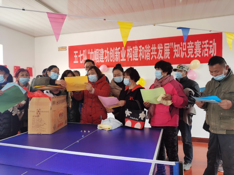 “活動(dòng)開(kāi)始!”隨著五七隊(duì)婦女主任一聲令下,活動(dòng)室的大門(mén)被打開(kāi),喜慶的彩帶、鮮艷的國(guó)旗撲入眼簾,而此刻最吸引大家的還是間夾其中的知識(shí)競(jìng)賽題。職工居民紛紛走到賽題前,讀題、思考,互相學(xué)習(xí)交流,競(jìng)賽現(xiàn)場(chǎng)其樂(lè)融融。據(jù)了解,此次知識(shí)競(jìng)賽精心設(shè)計(jì)了政治法律、黨史知識(shí)、農(nóng)業(yè)生產(chǎn)、婦女健康、道德規(guī)范、企業(yè)文化等60條賽題,讓婦女們?cè)跉g快的節(jié)日氛圍中學(xué)習(xí)知識(shí),提升本領(lǐng)。