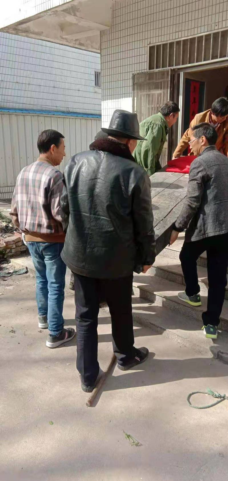 4月16日,新洋農(nóng)場社區(qū)管理人員微信群里,城西居委會工作人員分享了一張照片,照片上,居委會主任蔡文良正同幾位居民一起將一口棺材抬往室內(nèi),大家紛紛點贊,說這工作不容易。
