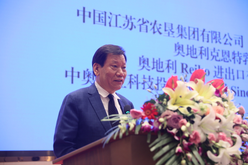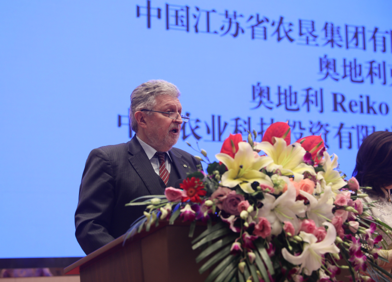 陳存根在講話中對合作框架協(xié)議的簽署表示熱烈的祝賀。他深情回憶了30多年前在奧地利學習生活的經(jīng)歷以及后來在西北農大、楊凌農業(yè)高新區(qū)工作的情景。他表示,能夠見證中奧兩國在乳業(yè)合作上取得進展,十分高興,也圓了自己的一個夢想。他認為,中國是人口大國,吃飯問題永遠是頭等大事,中華民族5000年文明史就是一部農耕文明史。改革開放以來,中國最大的成就是從“吃不飽”到“吃得飽”再向“吃得好”轉變?!俺缘煤谩庇袃蓪右饬x,一是食品安全和質量上要綠色、有機、健康,二是食物結構要調整。今天雙方合作框架協(xié)議的簽署對改善食品結構、提升食品質量、讓中國人吃得更好具有長遠和現(xiàn)實意義。他表示,奧地利畜牧業(yè)高度發(fā)達,技術和產品質量一流,而江蘇農墾擁有政治優(yōu)勢、資本優(yōu)勢、資源優(yōu)勢和市場優(yōu)勢,合作前景廣闊。期待框架協(xié)議早日開花結果、落地生根,為中奧兩國食品產業(yè)交流和友誼作出更大的貢獻。