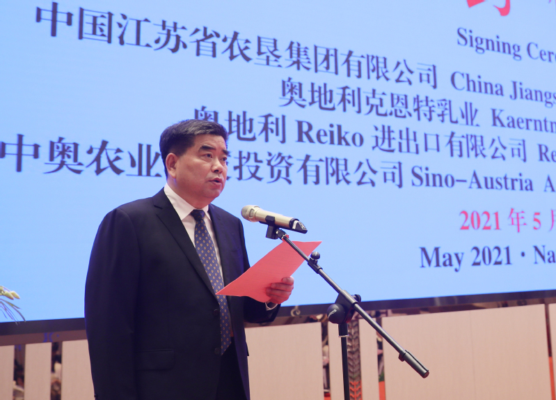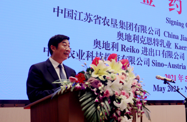 彼特勒對在江蘇和南京期間中方所給予的各種支持和幫助表示由衷的感謝,并介紹了中奧乳業(yè)國際合作項目的目標和理念。他說,中國各級政府和部門在“十四五規(guī)劃”中都特別重視農業(yè)問題,特別關注環(huán)保承受力和高品質的乳制品生產,既要長期應對滿足一個城市,一個區(qū)域,乃至一個國家人口對奶制品的供給側平衡,又要符合國際競爭中蓬勃發(fā)展的出口經(jīng)濟的國際標準。江蘇農墾是一家卓越領先的大型國有公司,在開發(fā)新農業(yè)技術應用和管理系統(tǒng)方面擁有豐富的經(jīng)驗,而奧地利克恩特乳業(yè)的新鮮原奶是被評為世界上品質最好的原料奶,生產約400個不同的產品。50年前的今天,中華人民共和國與奧地利共和國正式建立外交關系。他認為,國之交在于民相親,秉承相互尊重理解和支持的合作精神,今天的簽約儀式一定會為中奧建交50周年史上增添濃墨重彩的一筆。