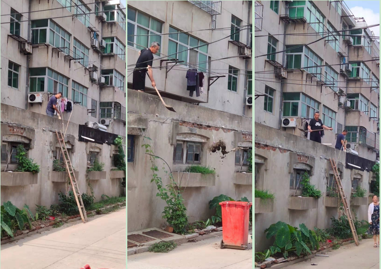 我們注意到,緊靠樓房的車庫(kù)頂上,由于風(fēng)雨的影響和樓上墜落的衣物衣架,一直以來積攢在車庫(kù)頂上,長(zhǎng)年累月就形成了一層看上去很不雅觀的垃圾,加上清掃不便,所以這里就成了影響視覺環(huán)境的一個(gè)遺忘的角落。居住在樓上的居民,為了居住環(huán)境的更友好,于是每隔一段時(shí)間,就相約聯(lián)合開展房頂垃圾的清理行動(dòng),不僅清理了自己樓下車棚頂上的垃圾,還將整幢樓的車庫(kù)垃圾清理個(gè)遍,這樣堆了好多年頭的“頑固垃圾”不見了,重新讓樓上的居民看到了樓下的”頂美“風(fēng)光。