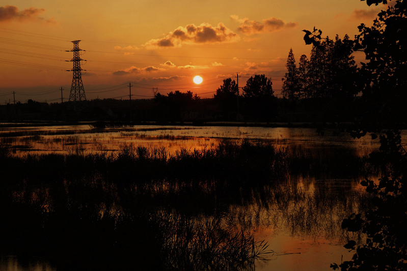 從新洋農(nóng)場跨過黃沙港,緊靠北岸的興橋鎮(zhèn)日新村,有一處400畝左右的魚塘,魚塘里長滿蘆葦、菖蒲等水生植物,常有鳥兒飛過和棲息,野鴨也不時(shí)地在水中游弋嘻戲。這哪是魚塘,分明是一處天然的濕地,并無人工雕琢,給人以原生態(tài)感覺。遠(yuǎn)處那高高聳立的輸電鐵塔,又參和進(jìn)了人文的元素,自然景觀與人文景觀相輔相成,相得益彰。每當(dāng)夕陽西下,云彩繚繞,晚霞飛紅之時(shí),那種剪影之美、濕潤之美、靜謐之美,美輪美奐,令人陶醉。