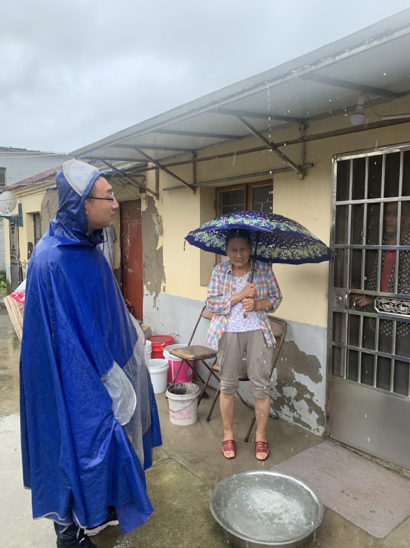 居家養(yǎng)老工作人員積極配合居委會,對轄區(qū)內(nèi)多個易積淹水點進行排查。提醒居民惡劣天氣盡量不外出,對自家太陽能進行加固處理。