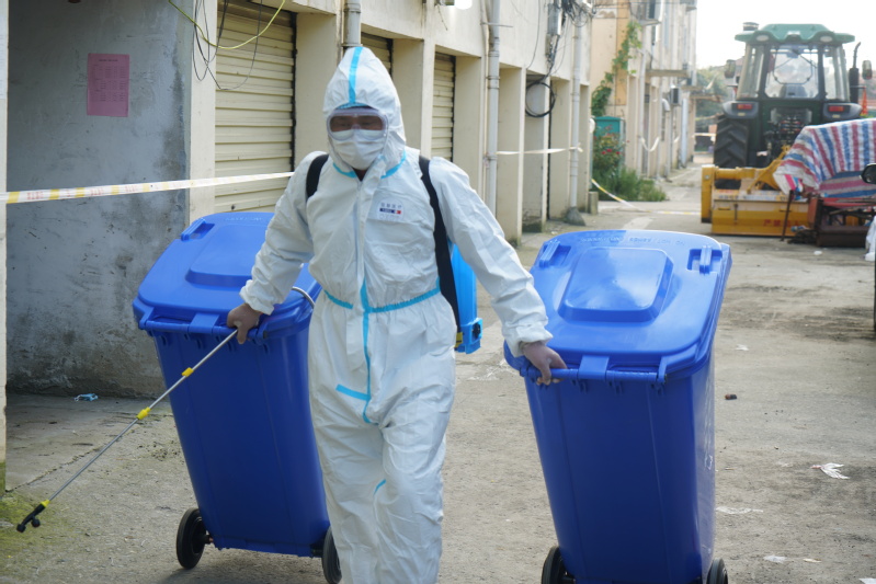 葉微是三河環(huán)衛(wèi)的負(fù)責(zé)人,每天,他帶著環(huán)衛(wèi)工人進(jìn)入各個(gè)小區(qū)進(jìn)行垃圾清運(yùn),這其中也包括重點(diǎn)管控區(qū)域的垃圾清運(yùn)和處理,在重點(diǎn)管控區(qū)域的垃圾清理中,葉微每天自己穿著防護(hù)服進(jìn)入小區(qū),先將垃圾筒進(jìn)行消毒,再對(duì)兩幢樓的樓道消毒,隨后醫(yī)務(wù)人員對(duì)兩幢樓的住戶進(jìn)行體溫檢測(cè),葉微一個(gè)人把四個(gè)垃圾筒消毒后,再把垃圾筒拖到垃圾車旁將垃圾裝入車中,然后再對(duì)垃圾筒進(jìn)行消毒,再拖回原位置,整個(gè)過程在五十分鐘左右。當(dāng)完成全部工作脫下防護(hù)服時(shí),葉微身上的汗水已經(jīng)順著褲管往下流,整個(gè)衣服全部濕透下,脫下防護(hù)服的第一件事便是找個(gè)地方坐下來休息片刻。