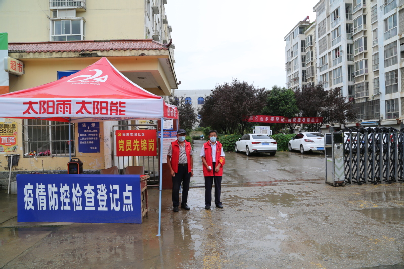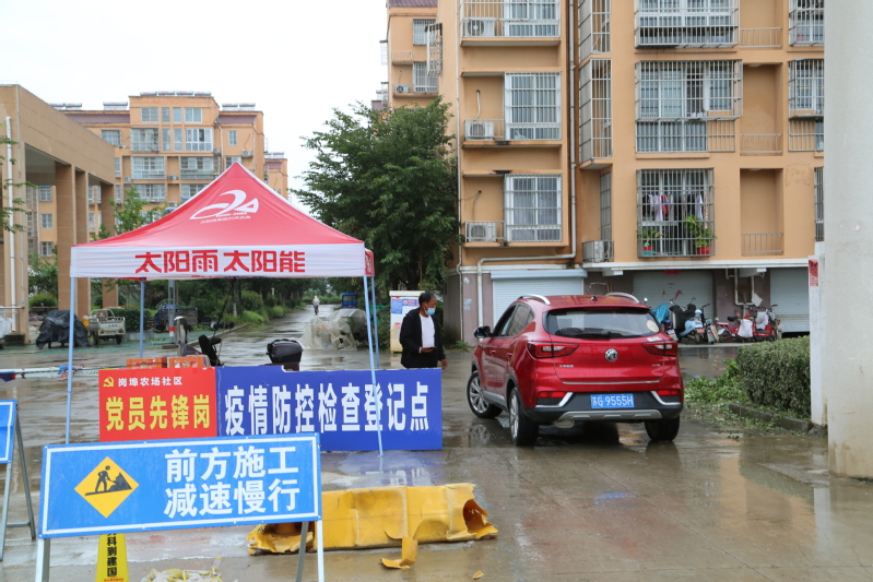在景秀家苑小區(qū)門口,黨員先鋒崗的牌子格外顯眼,兩名黨員者愿者站的筆挺,堅(jiān)守在雨中。在振興花園小區(qū),執(zhí)勤人員對(duì)外來(lái)車輛進(jìn)行嚴(yán)格詢問(wèn)登記,測(cè)量體溫。