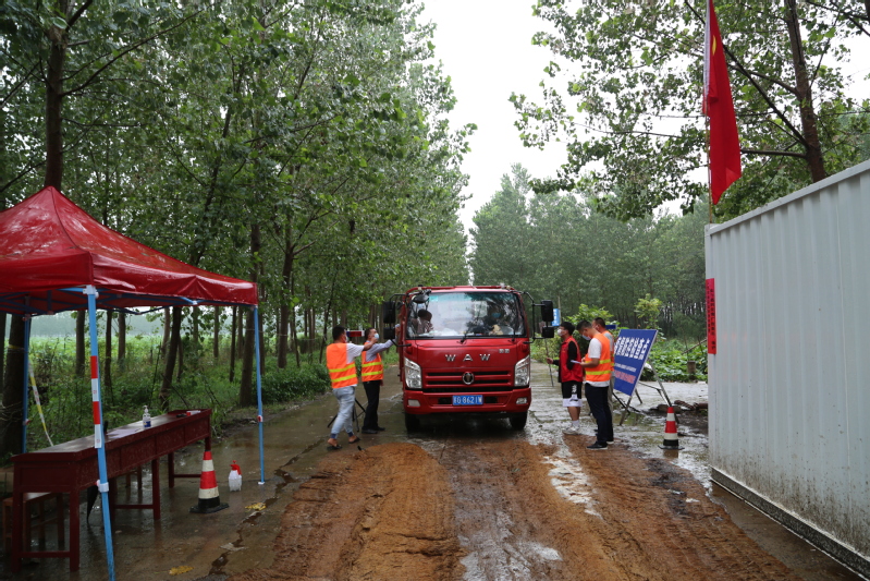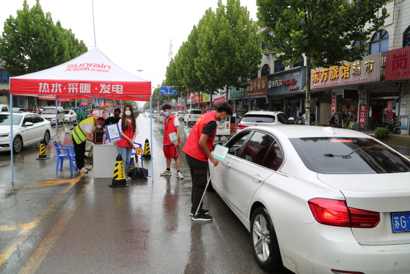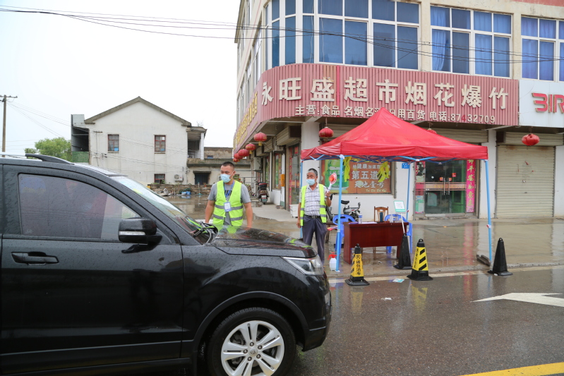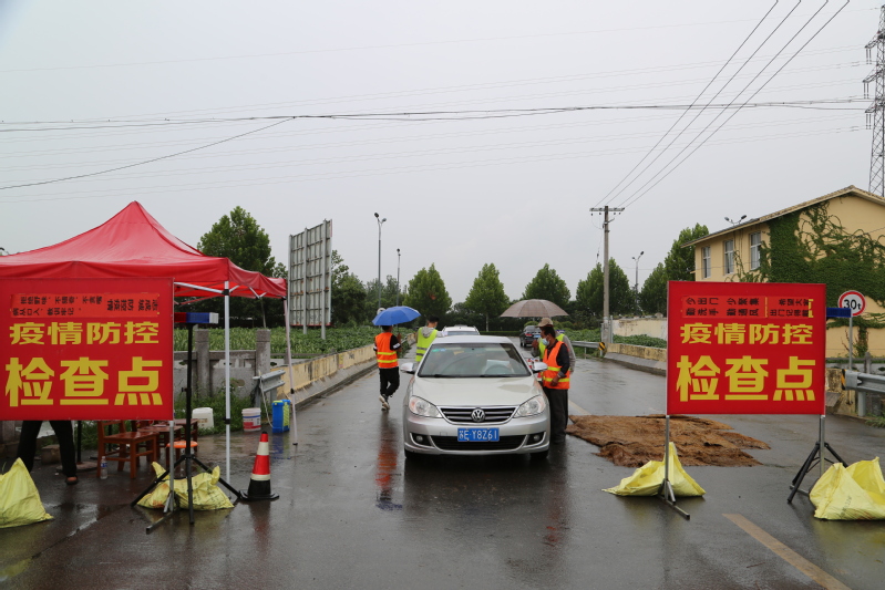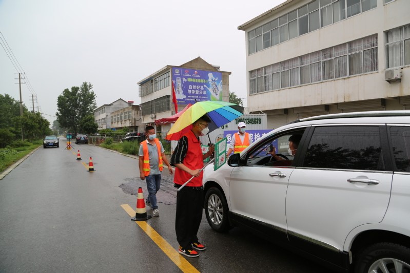 在騰飛南路卡口點(diǎn),排查人員正在對(duì)一輛外地車輛進(jìn)行排查,詳細(xì)了解其行程。該卡口是進(jìn)入鎮(zhèn)區(qū)的主要卡口,來(lái)往車輛最多,經(jīng)常會(huì)造成擁堵。但是執(zhí)勤人員并沒(méi)有因?yàn)橄掠旰蛽矶戮头潘膳挪榱Χ龋冀K在雨中耐心堅(jiān)守。
