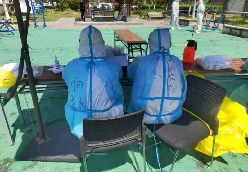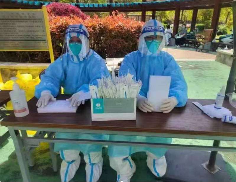 一日為醫(yī),終生不棄。張紅主動(dòng)擔(dān)當(dāng)國(guó)企的責(zé)任與使命。4月4日凌晨6點(diǎn)趕到上海浦東新區(qū)川沙鎮(zhèn)社區(qū),醫(yī)務(wù)人員相互之間穿戴好防護(hù)服、護(hù)目鏡、口罩、鞋套、手套、帽子,并進(jìn)行嚴(yán)而又嚴(yán)、實(shí)而又實(shí)、細(xì)而又細(xì)的防護(hù)檢查,沒(méi)有休息片刻就立即投入核酸采集的戰(zhàn)斗中。浦東新區(qū)疫情形勢(shì)嚴(yán)峻,面對(duì)被感染的風(fēng)險(xiǎn)和高負(fù)荷的工作壓力,張紅有條不紊地進(jìn)行核酸檢測(cè)采集工作。這是上海浦東新區(qū)全民核酸檢測(cè)第三天,也是核酸采集壓力最大的一天,采集現(xiàn)場(chǎng)的布置、醫(yī)護(hù)人員與新設(shè)備的磨合、工作人員與社區(qū)、居委會(huì)人員的協(xié)調(diào)、居民采集核酸的急迫心情等,多重矛盾交織在一起。對(duì)此,張紅和其他醫(yī)務(wù)人員爭(zhēng)分奪秒抓緊進(jìn)行核酸檢測(cè),炎熱的天氣、高強(qiáng)度的工作加之憋悶的防護(hù)裝備,衣衫不停的被汗水浸濕,再被身體烘干,再浸濕……臉部深深的壓痕成了標(biāo)配,人在汗水“泡”著里工作成了常態(tài)……到了晚上,為了緩解上海市疫情防控壓力,張紅又和同事們一起乘上大客車連夜返回到響水,趕到響水時(shí)已是4月5日凌晨1點(diǎn)多了。第一趟完成核酸檢測(cè)任務(wù)連續(xù)30個(gè)小時(shí)不吃不喝,張紅不言苦、不叫累。她堅(jiān)持以高度的責(zé)任心為前來(lái)做核酸檢測(cè)的人員提供服務(wù),她用真情和愛心譜寫著平凡而動(dòng)人的天使之歌!