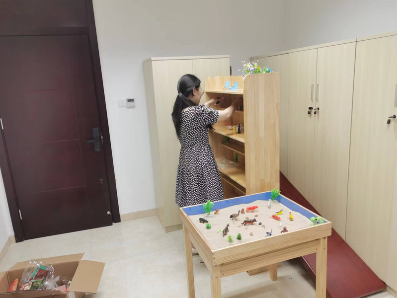 目前,淮海農(nóng)場(chǎng)社區(qū)民政辦正緊鑼密鼓的建立服務(wù)流程和日常管理需要的各類制度,建立健全困境兒童臺(tái)賬和活動(dòng)臺(tái)賬,預(yù)估10月底前,“淮海農(nóng)場(chǎng)未成年人保護(hù)站”的各項(xiàng)設(shè)施完善配置,并正式開放。圖為社區(qū)民政辦工作人員正布置心理咨詢室設(shè)施。