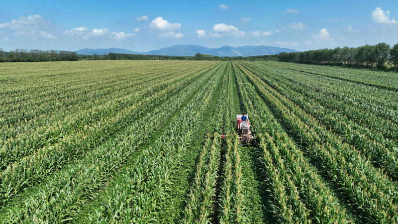 蘇墾農(nóng)發(fā)抓好12萬畝玉米大豆帶狀復(fù)合種植精細(xì)化管理,在去年成功試驗(yàn)的基礎(chǔ)上,組織農(nóng)機(jī)對(duì)玉米進(jìn)行去頂,既降低植株高度,減少倒伏風(fēng)險(xiǎn),又增加了玉米大豆受光面積,促進(jìn)產(chǎn)量提高。圖為農(nóng)機(jī)在蘇墾農(nóng)發(fā)東辛分公司玉米大豆田間進(jìn)行玉米去頂作業(yè)。