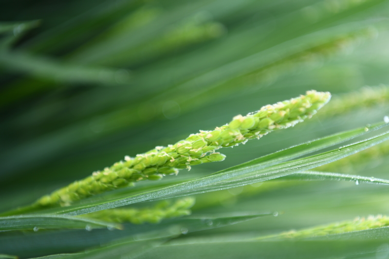 陽光下,霧氣散,空氣中彌漫著清新的稻花香。俯瞰蔥綠的稻田,如一條條綠絲帶整齊排列。晶瑩的晨露凝結(jié)在青翠的秧苗上,猶如給稻田蒙上了一層剔透的面紗。剛抽出的稻穗上,有白色的稻花點(diǎn)點(diǎn),隨著稻穗一起隨風(fēng)輕舞飛揚(yáng)。小蜘蛛也趕來湊個(gè)熱鬧,在枝葉上織起了“秋的毛衣”。