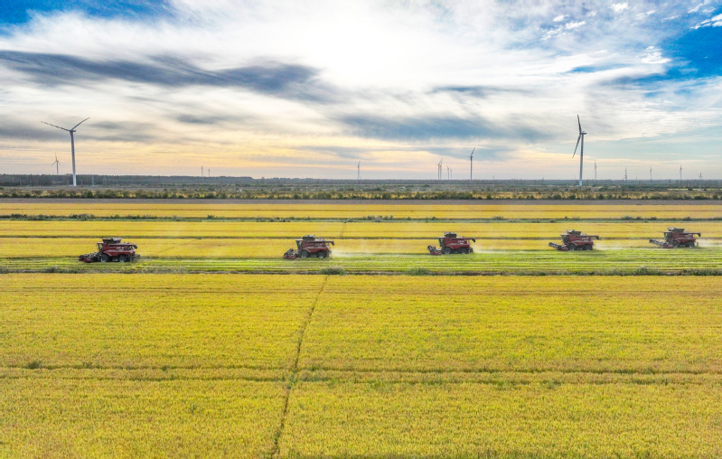 2023年10月28日,在蘇墾農(nóng)發(fā)新洋分公司新南生產(chǎn)區(qū)19大隊(duì)的高標(biāo)準(zhǔn)農(nóng)田上,五臺(tái)凱斯7088大型聯(lián)合收割機(jī)穿梭在稻田中搶收水稻。蘇墾農(nóng)發(fā)新洋分公司搶抓晴好天氣,發(fā)揮農(nóng)墾企業(yè)機(jī)械化優(yōu)勢,確保秋糧顆粒歸倉。