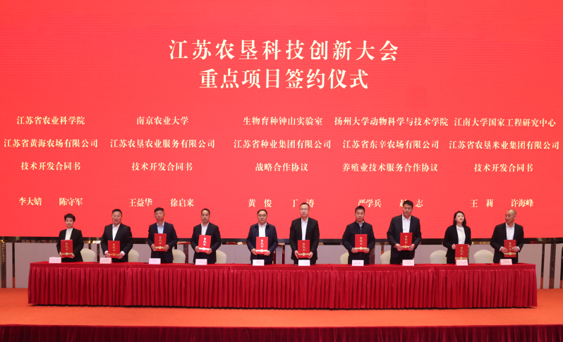 會(huì)上,吳本輝、姜建友共同為江蘇農(nóng)墾漁業(yè)科技有限公司和江蘇省農(nóng)墾產(chǎn)業(yè)技術(shù)研究院有限責(zé)任公司揭牌,吳本輝為蘇墾漁業(yè)研發(fā)中心、蘇墾米業(yè)研發(fā)中心、蘇墾麥芽科技創(chuàng)新中心、金太陽糧油研發(fā)中心、勤奮藥業(yè)研發(fā)中心、金象傳動(dòng)研發(fā)中心授牌,姜建友發(fā)布江蘇農(nóng)墾2024-2025年揭榜掛帥項(xiàng)目榜單,生物育種鐘山實(shí)驗(yàn)室、省農(nóng)科院、南京農(nóng)業(yè)大學(xué)、江南大學(xué)、揚(yáng)州大學(xué)分別與集團(tuán)公司所屬企業(yè)簽署重點(diǎn)項(xiàng)目合作協(xié)議。