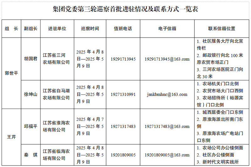 集團(tuán)黨委巡察組將在被巡察農(nóng)場現(xiàn)場巡察1個月左右,期間設(shè)立專門值班電話、電子信箱、聯(lián)系信箱等,主要受理反映被巡察農(nóng)場黨委領(lǐng)導(dǎo)班子及其成員、相關(guān)重點崗位干部(含已離退休、已調(diào)離)問題的來信來電來訪,重點是關(guān)于違反政治紀(jì)律、組織紀(jì)律、廉潔紀(jì)律、群眾紀(jì)律、工作紀(jì)律和生活紀(jì)律等方面的舉報和反映。其他不屬于巡察受理范圍的信訪問題,將按規(guī)定由有關(guān)部門認(rèn)真處理。信訪受理時間截止到2025年5月7日。