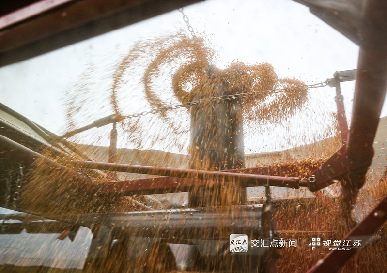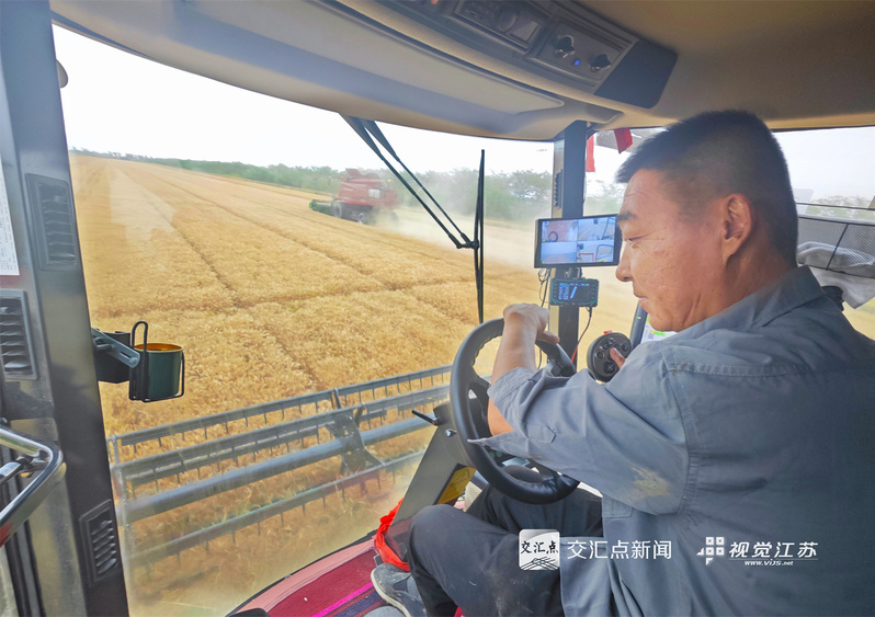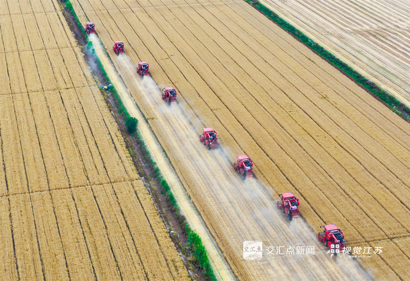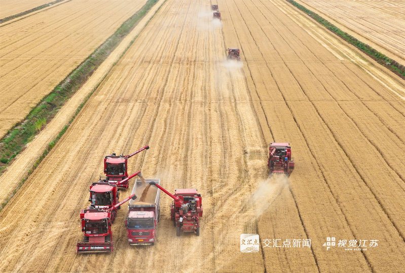 (特約攝影 許昌銀 錢厚紅 15:24攝 20:39上線)五月的麥田,金穗飄香。5月26日,淮安盱眙洪澤湖畔的江蘇農(nóng)墾三河農(nóng)場(chǎng)的3.82萬(wàn)畝小麥開(kāi)鐮收割。當(dāng)?shù)乩们绾锰鞖饧泳o收割,確保顆粒歸倉(cāng)。
