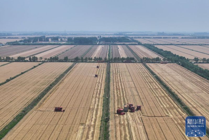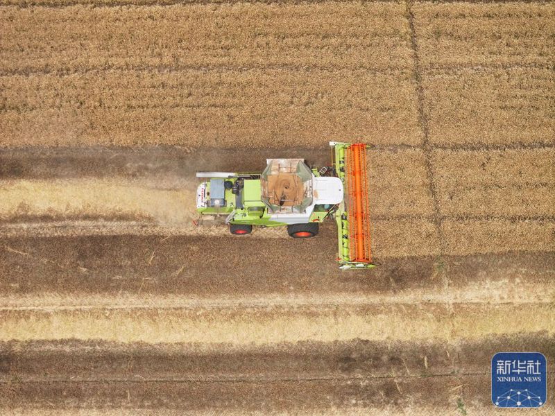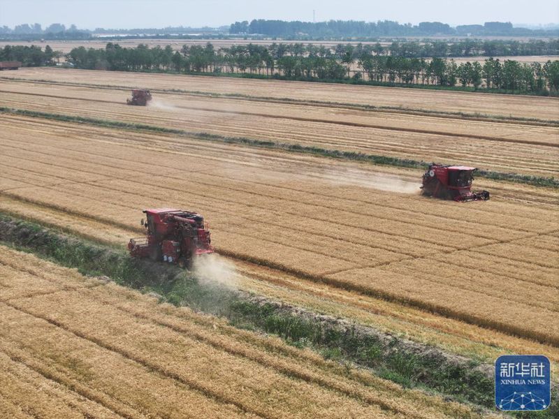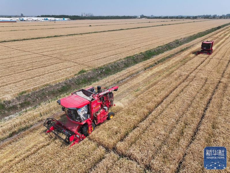 5月28日,收割機(jī)在三河農(nóng)場收割小麥(無人機(jī)照片)。新華社記者 季春鵬 攝