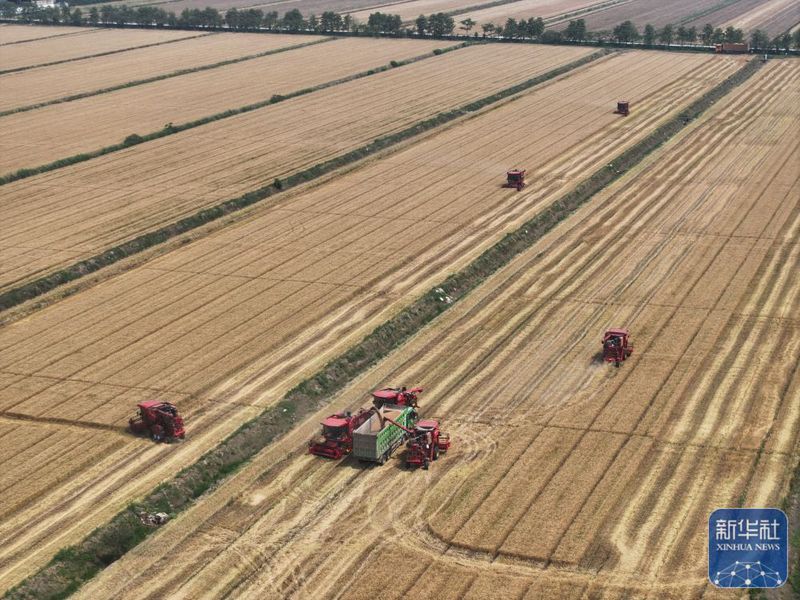 5月28日,在江蘇農(nóng)墾三河農(nóng)場,收割機(jī)在收割小麥(無人機(jī)照片)。新華社發(fā)(許昌銀攝)