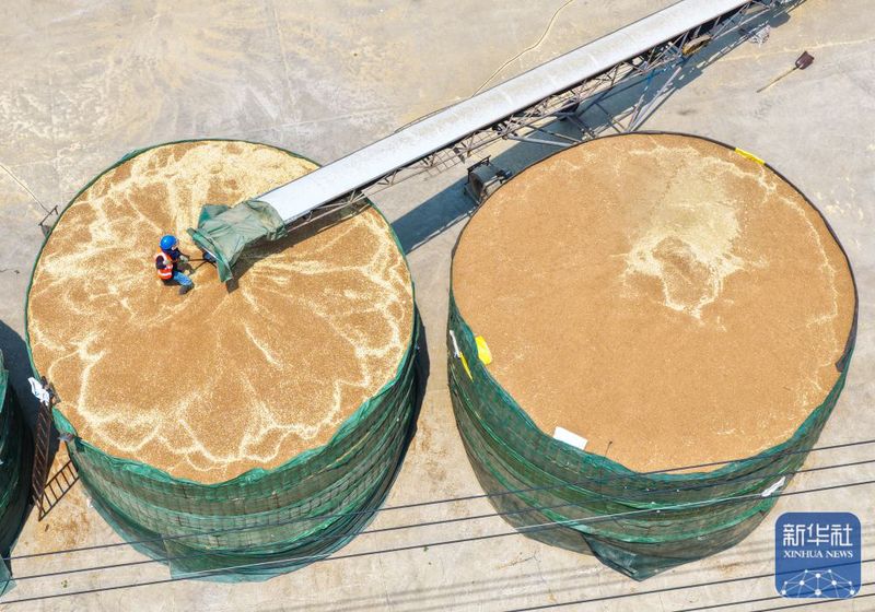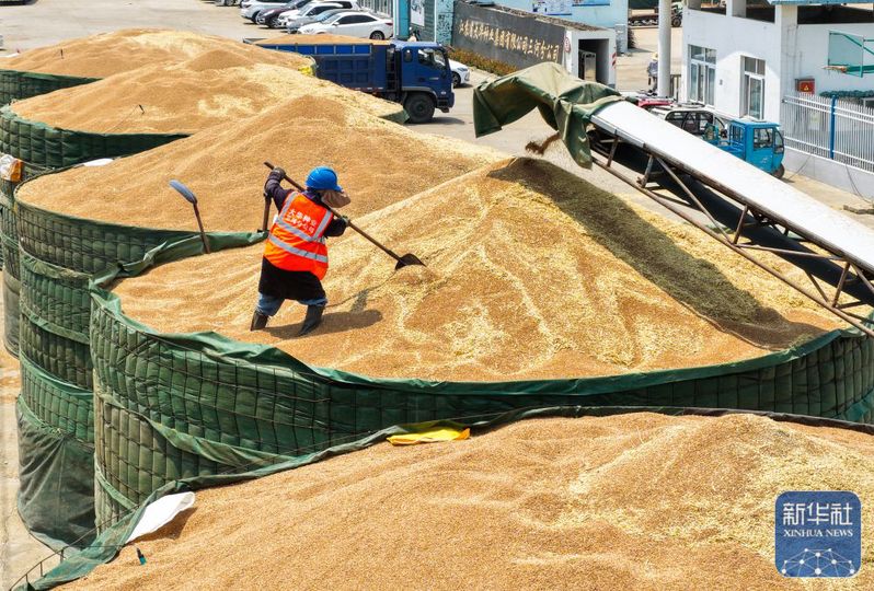 三河農(nóng)場收獲的小麥進(jìn)入大華種業(yè)三河分公司存儲(5月28日攝,無人機(jī)照片)。新華社發(fā)(許昌銀攝)