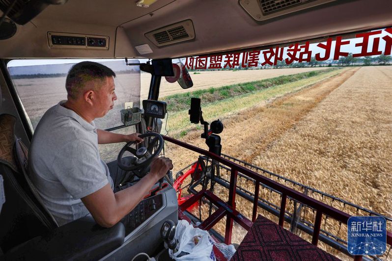 5月28日,江蘇農(nóng)墾三河農(nóng)場農(nóng)機(jī)手操作收割機(jī)收割小麥。新華社發(fā)(許昌銀攝)