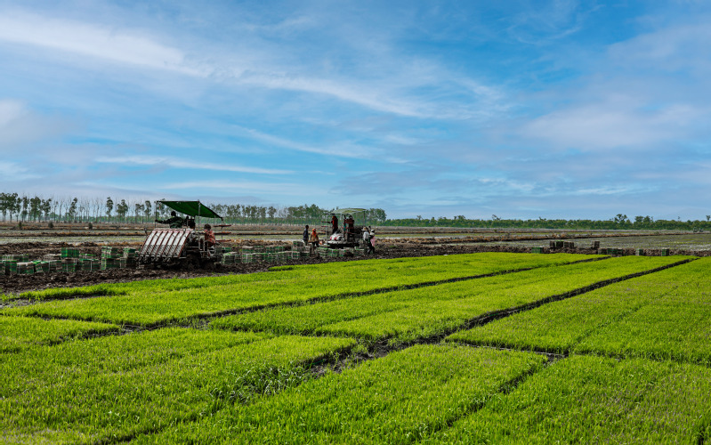 端午假期第一天,蘇墾農發(fā)南通分公司3大隊田頭一片忙碌景象。烈日下,7位農技人員彎著腰在水稻田一字排開移栽秧苗,腳下步履維艱、鼻頭汗珠滴落。按照隊伍兩頭農技人員手拉的直線,他們小心翼翼地從秧盤上取下秧苗,左手握苗,右手插秧,確保行距25厘米,株距20厘米,每穴2株,橫豎成線、深度適中。每隔一段距離,田間都會插上一塊寫明實驗數據的標簽。“不同的標簽對應了不同的試驗稻種。人工插秧可以確保水稻增產試驗的科學性、嚴謹性、準確性?!碧K墾農發(fā)南通分公司農業(yè)中心主任趙中華表示。今年,蘇墾農發(fā)南通分公司大力推進農業(yè)科技創(chuàng)新,與南通大學生命科學學院合作開展水稻高產技術研發(fā),為南通稻米產業(yè)供給性結構優(yōu)化、品質提升、節(jié)本增效和綠色高產提供技術支撐。前期,校企雙方分別對南粳46、南粳5055稻種以微波、離心、超聲波等3種方式,按時間長度各進行32種處理。落谷前,蘇墾農發(fā)南通分公司對不同品種、不同處理的水稻種子提前進行了篩選、收集、稱重、貼標、裝袋等準備工作,同時與相關農業(yè)大隊溝通協(xié)調好浸種催芽時間,在種子露白后及時安排工人與農機,掌握好落谷的最佳時機與最優(yōu)質量,控制種子秧盤播撒的均勻度,精準把控好土壤濕度與精細