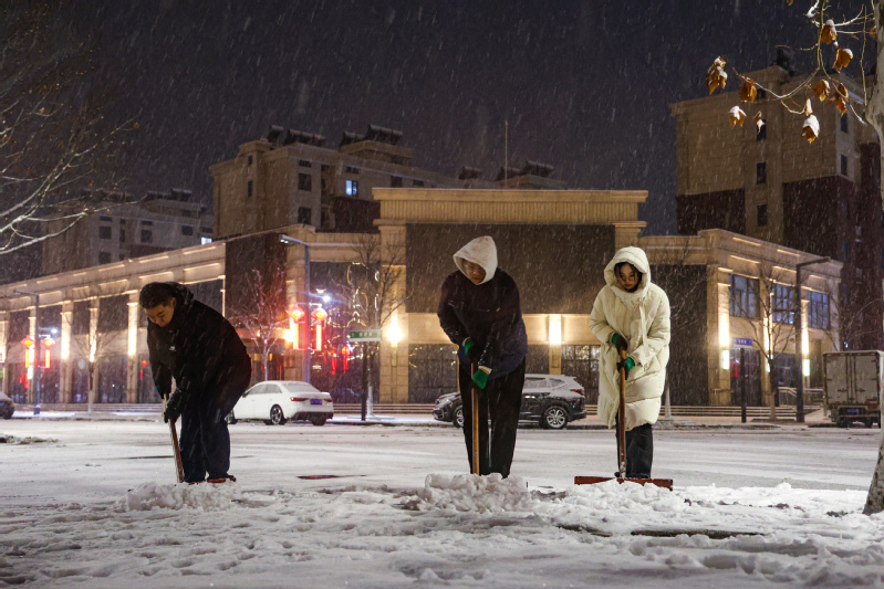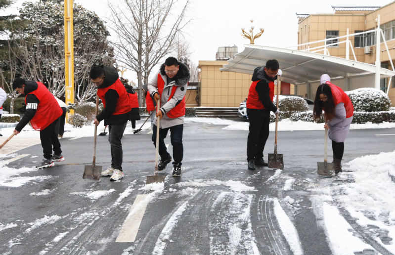 2月4日,連云港再降大雪,云臺農(nóng)場部分地區(qū)積雪嚴重。云臺農(nóng)場公司黨委迅速反應、精準發(fā)力,立即啟動暴雪天氣應急預案,積極組織華泰物業(yè)公司,農(nóng)場社區(qū)城管隊、各居委會網(wǎng)格員等形成志愿小組,即刻開展“清除道路積雪 保障通行安全”行動,各單位、部門迎雪而上,全力以赴保障場域居民群眾出行安全。在清雪過程中,采取“人工+機械”方式進行清除,有的在場域內(nèi)主次干道,使用鏟雪車、撒鹽車,有序配合;有的拿著鐵鍬、掃帚等清雪工具,手動鏟雪,并用盆潑灑融雪劑,清理雪泥積水,清運的隊伍浩浩蕩蕩。冰冷的雪花飄下,刺骨的寒風吹在志愿者的臉上、手上,可志愿者們不顧嚴寒,個個干的熱火朝天,掀起了一波清雪“大作戰(zhàn)”?!靶⌒牡鼗?,大家一定要注意自身安全?!薄靶逼鲁┮欢ㄒ⒁?,關注一下往來的車輛?!敝驹刚叽捩面煤暗??!拔覀冎幌氡M快保障通暢出行,確保居民們的安全?!敝驹刚唠鴤ゴ謿飧嬖V筆者。志愿者們克服惡劣天氣等不利因素帶來的影響,對場域內(nèi)公共區(qū)域進行連續(xù)作業(yè),最大限度保障居民安全出行,不畏嚴寒、不怕辛苦,以昂揚的精神面貌繼續(xù)奮戰(zhàn)在除雪保暢一行。
