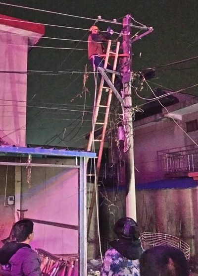 東辛“電雷鋒”們?cè)诤菇拥焦收舷⒑螅谝粫r(shí)間趕赴現(xiàn)場(chǎng),他們克服道路冰凍行走困難、電桿覆冰攀爬濕滑等不利因素,頂著刺骨的寒風(fēng),咬緊牙關(guān)一步一個(gè)腳印,仔細(xì)進(jìn)行設(shè)備檢查和維修,在桿上艱難地完成每一個(gè)動(dòng)作,一刻也沒有停歇,以最快速度搶修受損線路恢復(fù)居民用電。