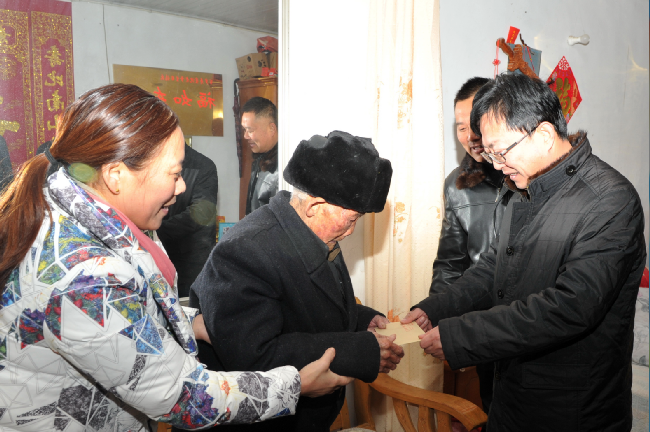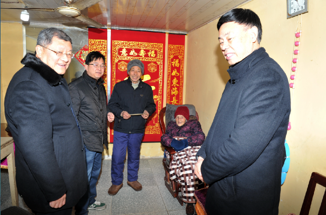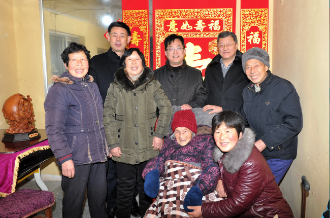 “我們黨政工領(lǐng)導(dǎo)來給您拜年了!”王進(jìn)強(qiáng)一進(jìn)門就對(duì)坐在沙發(fā)上的百歲老人說。