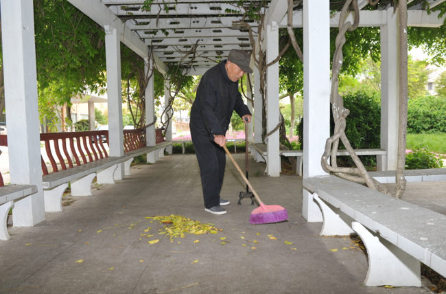 “開始掃地時(shí),我把掃帚和簸箕放在綠化叢中,沒曾想,僅過了一周,掃地的工具不見了蹤影,以后,我只好每天上午或是中午,提前帶著掃帚簸箕和抹布來這里揩擦打掃,在其他老人還沒到來之前,掃清長(zhǎng)椅地面,揩去鳥蟲屎后,再垃圾倒入100米開外的垃圾桶中。”楊文才告訴我。