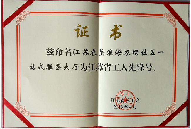 近日,省總工會(huì)授予江蘇農(nóng)墾淮海農(nóng)場社區(qū)一站式服務(wù)大廳獲江蘇省“工人先鋒號(hào)”榮譽(yù)稱號(hào),這是淮海農(nóng)場社區(qū)首次獲此殊榮。