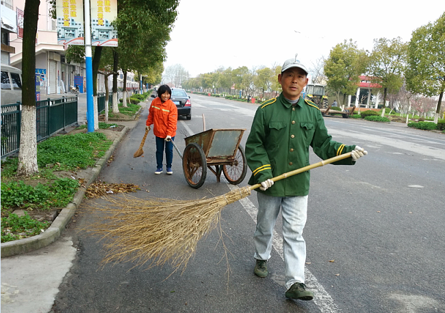 每天當(dāng)我起早走在淮海路上時(shí),總能看到淮海路東西兩邊都有一對(duì)夫婦,穿著桔紅色的工作服在清掃淮海路面時(shí)的鏡頭。雖然保潔工作只是他們其中一個(gè)人的工作,但為了在盡短的時(shí)間內(nèi),完成路面的清掃和保潔工作,他們往往在起早動(dòng)手的同時(shí),還喊來(lái)了妻子或是丈夫,一起幫忙,利用人少便于清掃的時(shí)機(jī),婦唱夫隨,拿著掃帚、拎著手叉、推著小車,開(kāi)始了一天又一天往復(fù)的工作,為農(nóng)場(chǎng)換上了一件整潔的新裝。他們總是起得很早很早,清掃垃圾、處理污穢,盡量減少清掃和運(yùn)輸途中,垃圾產(chǎn)生的氣味對(duì)職工居民的影響。也正是他們不辭辛勞和默默地奉獻(xiàn),讓你為生活在這個(gè)農(nóng)場(chǎng)而自豪,令你擁有這份環(huán)境而愉悅,而這些又讓我為之動(dòng)容。