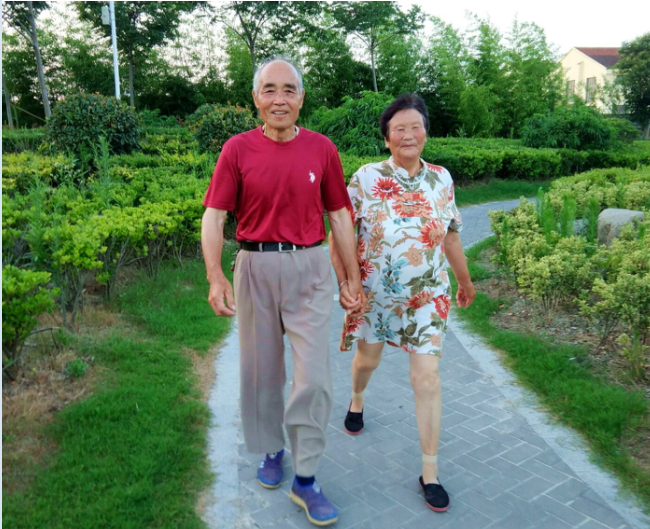 故事的主人公名叫施學(xué)兵,今年77歲。妻子叫吳炳如,小他兩歲,他們住在射陽縣淮海農(nóng)場振興小區(qū)一間簡陋的房子里。每天傍晚他倆都要來公園里兜圈,并牽手走上六七公里路程,然后再到公園內(nèi)的器材上拉伸鍛煉,舒展下筋骨,這對恩愛夫妻成為淮海公園內(nèi)的一道美麗風(fēng)景。