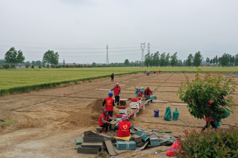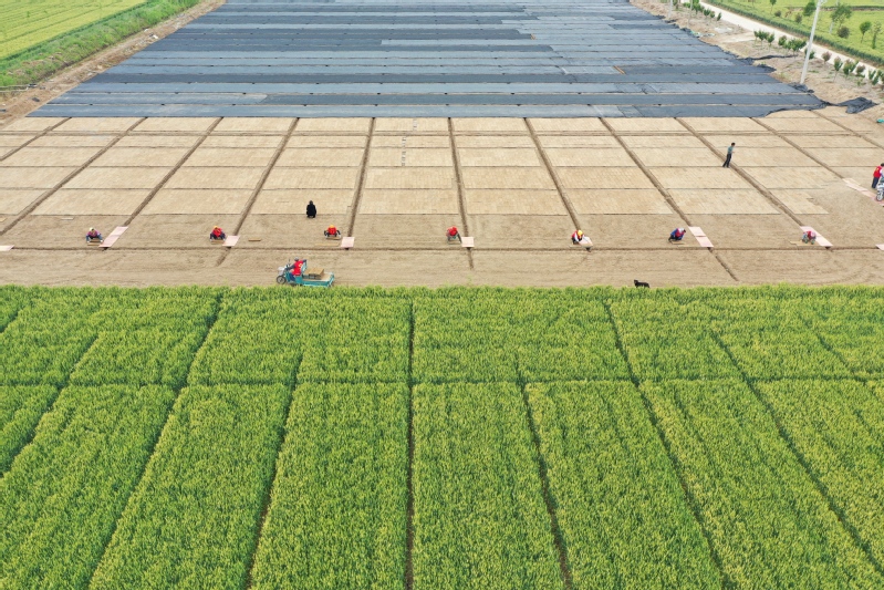 5月10日,寶應(yīng)湖農(nóng)場五七大隊(duì)田間,10名志愿服務(wù)者正在如火如荼地進(jìn)行流水線育秧。