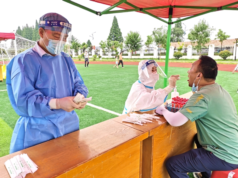 把廣場當(dāng)戰(zhàn)場,在團結(jié)協(xié)作中恪盡職守。早晨五點半,居民們陸續(xù)趕來參加核酸檢測。只見徐加云一身藍色防護服,頭戴隔離面罩,手著橡膠手套,行色匆匆地忙碌在服務(wù)一線。指導(dǎo)掃碼、測量體溫、維持兩米線……看到需要引導(dǎo)的居民,他主動上前做起引導(dǎo)員;遇到腿腳不靈便的老人,他連忙攙扶做起志愿者;碰到哪個點位需要人手,他自愿加入做起服務(wù)員。溫度迅速攀升,衣服早已干了又濕,他卻毫不在意。拿起消毒噴壺,他仔細地為采樣臺、醫(yī)用垃圾箱、人員等候區(qū)等處消毒。為縮短居民等待時間,加快采樣速度,他提前為醫(yī)護人員準備好核酸檢測咽拭子棉簽?!拔沂怯游瘯ぷ魅藛T,這些都是我應(yīng)該做的,更何況我還是一名共產(chǎn)黨員,全心全意為人民服務(wù)是我的職責(zé)?!碑?dāng)被問到辛不辛苦時,他笑著回答道。歷時三小時十分鐘,迎湖廣場檢測點完成樣本采集1080份。核酸檢測高效率的背后,是徐加云的點滴付出,也是一個個共產(chǎn)黨員團結(jié)協(xié)作的結(jié)果。