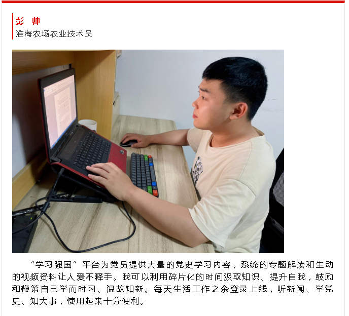 淮海各基層的黨員群眾堅持每天打卡答題,積分你追我趕,大家的學習積極性高漲,實現(xiàn)了從“要我學”變“我要學”,從“被動學”變“主動學”的轉變。通過答題活動,進一步加強了常態(tài)化制度化使用“學習強國”學習平臺,在互學互比中實現(xiàn)互進互促。圖為彭帥在射陽宣傳第8期上的學習感悟。