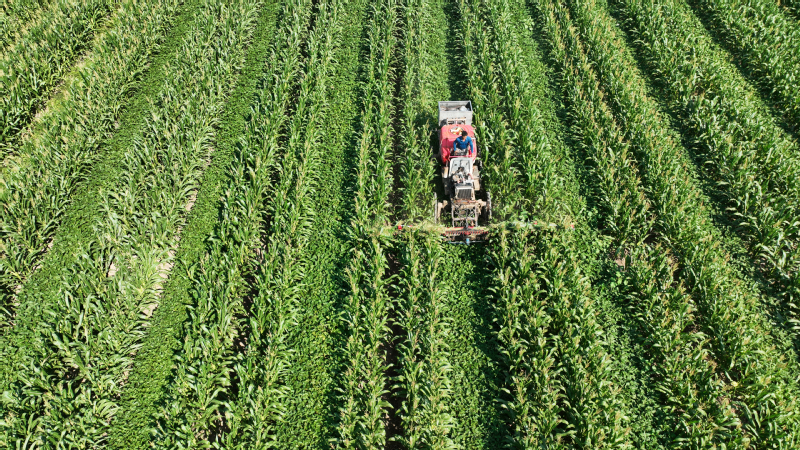 蘇墾農(nóng)發(fā)抓好12萬畝玉米大豆帶狀復(fù)合種植精細(xì)化管理,在去年成功試驗(yàn)的基礎(chǔ)上,組織農(nóng)機(jī)對(duì)玉米進(jìn)行去頂,既降低植株高度,減少倒伏風(fēng)險(xiǎn),又增加了玉米大豆受光面積,促進(jìn)產(chǎn)量提高。圖為農(nóng)機(jī)在蘇墾農(nóng)發(fā)東辛分公司玉米大豆田間進(jìn)行玉米去頂作業(yè)。