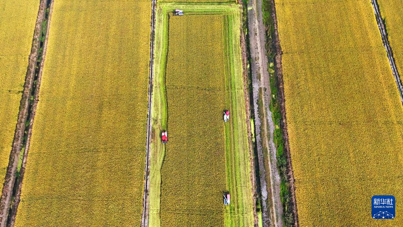 江蘇省連云港市海州區(qū)崗埠農(nóng)場工作人員在搶收水稻(無人機(jī)照片)。新華社發(fā)(耿玉和 攝)