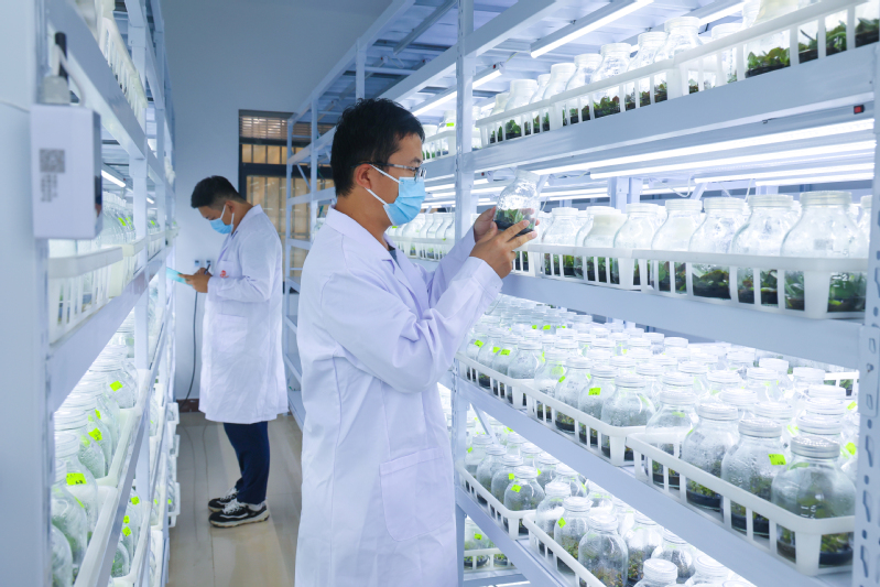 在江蘇農(nóng)墾云臺(tái)農(nóng)場(chǎng)的蝴蝶蘭培養(yǎng)室里,培養(yǎng)架上排列著一瓶瓶嫩綠的幼苗。通過(guò)精準(zhǔn)調(diào)控光照波長(zhǎng)、濕度梯度和營(yíng)養(yǎng)配方,不僅可以縮短蝴蝶蘭育苗周期,還能顯著提高苗子的成活率和抗病性。圖為技術(shù)人員在開(kāi)展日常蝴蝶蘭幼苗培育觀測(cè)工作,并同步系統(tǒng)記錄生長(zhǎng)數(shù)據(jù)及環(huán)境調(diào)控參數(shù)?! ?/p>