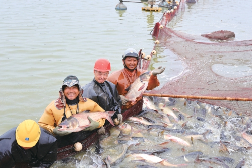 近日,江蘇省連云港市海州區(qū)的江蘇農(nóng)墾崗埠農(nóng)場(chǎng),工人們?cè)隰~(yú)塘里拉網(wǎng)捕撈分揀花鰱、白鰱等水產(chǎn)品,準(zhǔn)備發(fā)往周邊市場(chǎng)銷售?!?br />