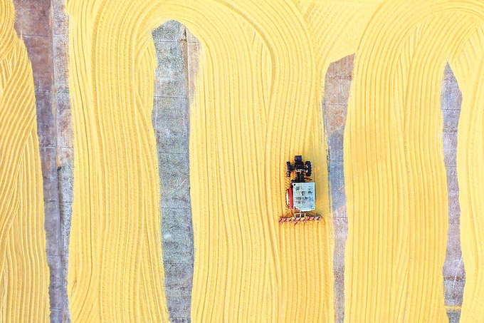 10月27日,連云港市海州區(qū)的江蘇農墾崗埠農場,職工駕駛糧食翻曬機械在場上來回穿梭,翻曬剛剛收獲的水稻。 陶桂軍 嚴連鳳 攝(視覺江蘇網供圖)