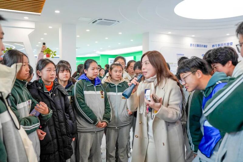 “原來奶牛是這樣擠奶的!太神奇了……”在可視化擠奶廳里,師生們的驚嘆聲此起彼伏。兩座全自動(dòng)轉(zhuǎn)盤式利拉伐擠奶機(jī)正在運(yùn)轉(zhuǎn),一頭頭黑白花奶牛有序走上轉(zhuǎn)盤,擠奶員則熟練地進(jìn)行著前藥浴、驗(yàn)?zāi)獭⑻妆?、后藥浴等?biāo)準(zhǔn)化操作,整個(gè)流程清晰直觀地呈現(xiàn)在眾人眼前?!袄蠋?,這些奶牛每天能產(chǎn)多少奶呀?”一名戴眼鏡的男生舉手提問。講解員小張笑著解答:“一頭牛最高可以產(chǎn)70公斤牛奶,產(chǎn)出的牛奶都要經(jīng)過100多項(xiàng)指標(biāo)檢測(cè),達(dá)標(biāo)合格后才能走向市場(chǎng)。”在智慧化生態(tài)展廳,師生們既能通過圖文展板系統(tǒng)學(xué)習(xí)奶牛品種特性、科學(xué)飼養(yǎng)方法及飼料配方等基礎(chǔ)知識(shí),又能通過蘇墾乳業(yè)數(shù)字牧場(chǎng)展示平臺(tái)實(shí)時(shí)查看每頭奶牛的身份檔案、生長(zhǎng)曲線、產(chǎn)奶數(shù)據(jù)及健康監(jiān)測(cè)指標(biāo),沉浸式感受科技為傳統(tǒng)養(yǎng)殖業(yè)帶來的變革。“這次研學(xué)真是讓我親眼看到了科技養(yǎng)牛的力量,原來一杯好牛奶的誕生背后,藏著這么多學(xué)問!”一位帶隊(duì)老師感慨道。