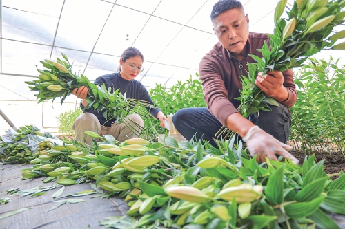 寒冬時(shí)節(jié),江蘇農(nóng)墾崗埠農(nóng)場(chǎng)高效農(nóng)業(yè)示范園11號(hào)大棚內(nèi)一片春意盎然。一株株百合花挺拔站立,不少花苞已露出粉色,在綠葉的襯托下格外嬌艷動(dòng)人。去年,崗埠農(nóng)場(chǎng)高效農(nóng)業(yè)示范園大力發(fā)展鮮切花產(chǎn)業(yè),引進(jìn)了“中國(guó)紅”“索蚌”等百合花品種,共種植14萬(wàn)株。通過(guò)為周邊種植戶提供技術(shù)指導(dǎo),農(nóng)場(chǎng)帶動(dòng)大家發(fā)展鮮切花產(chǎn)業(yè)。圖為工作人員正在整理百合鮮切花。