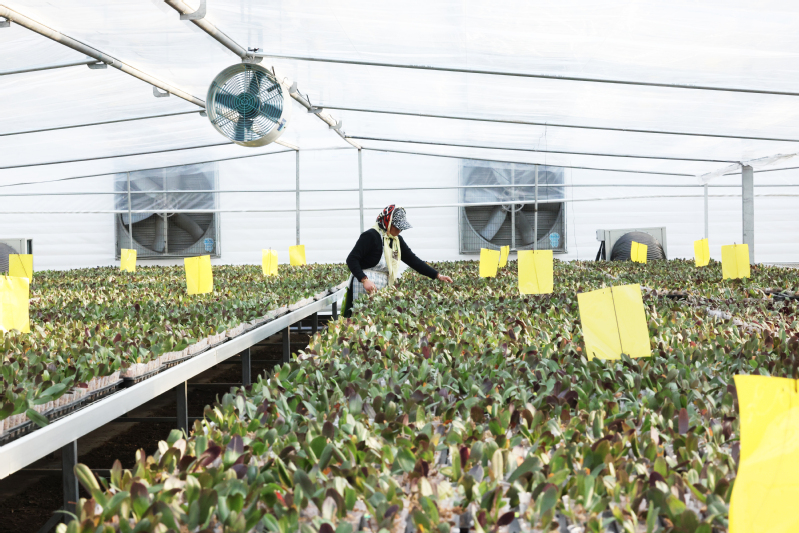 2月17日,云臺農(nóng)場興墾科技員工在整理啤酒花藤蔓(上圖)。2月17日,云臺農(nóng)場興墾科技工作人員在整理蝴蝶蘭育苗(下圖)。